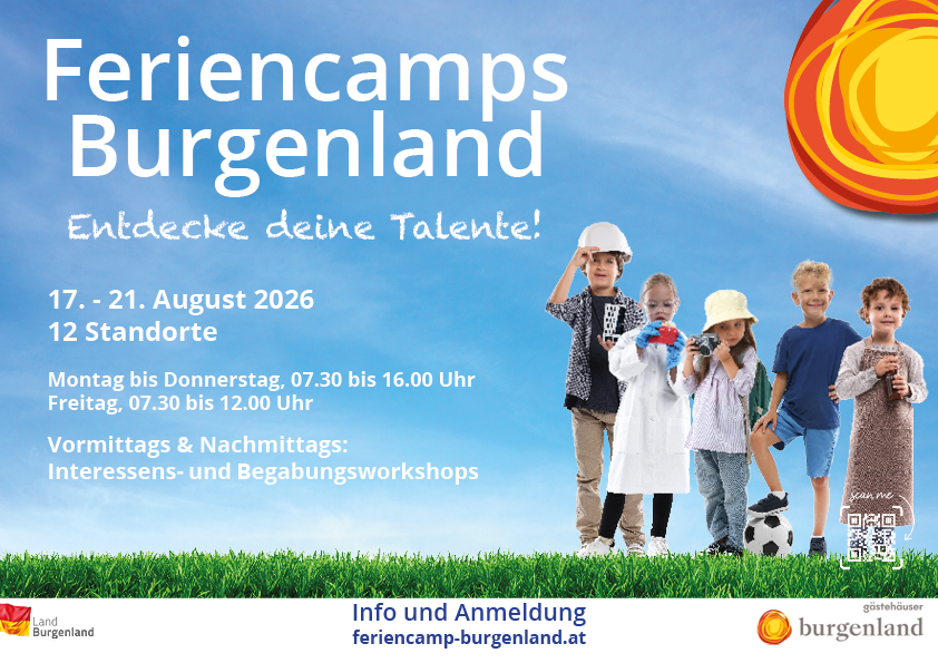 In der 7. Sommerferienwoche vom 17. – 21. August findet an 12 Standorten das Feriencamp im Burgenland statt. Ziel ist es den Kindern und Jugendlichen ab dem letzten verpflichtenden Kindergartenjahr bis zur 8. Schulstufe ein reichhaltiges Lern- und Ferienangebot nach dem Motto „Entdecke deine Talente“ zu bieten.
